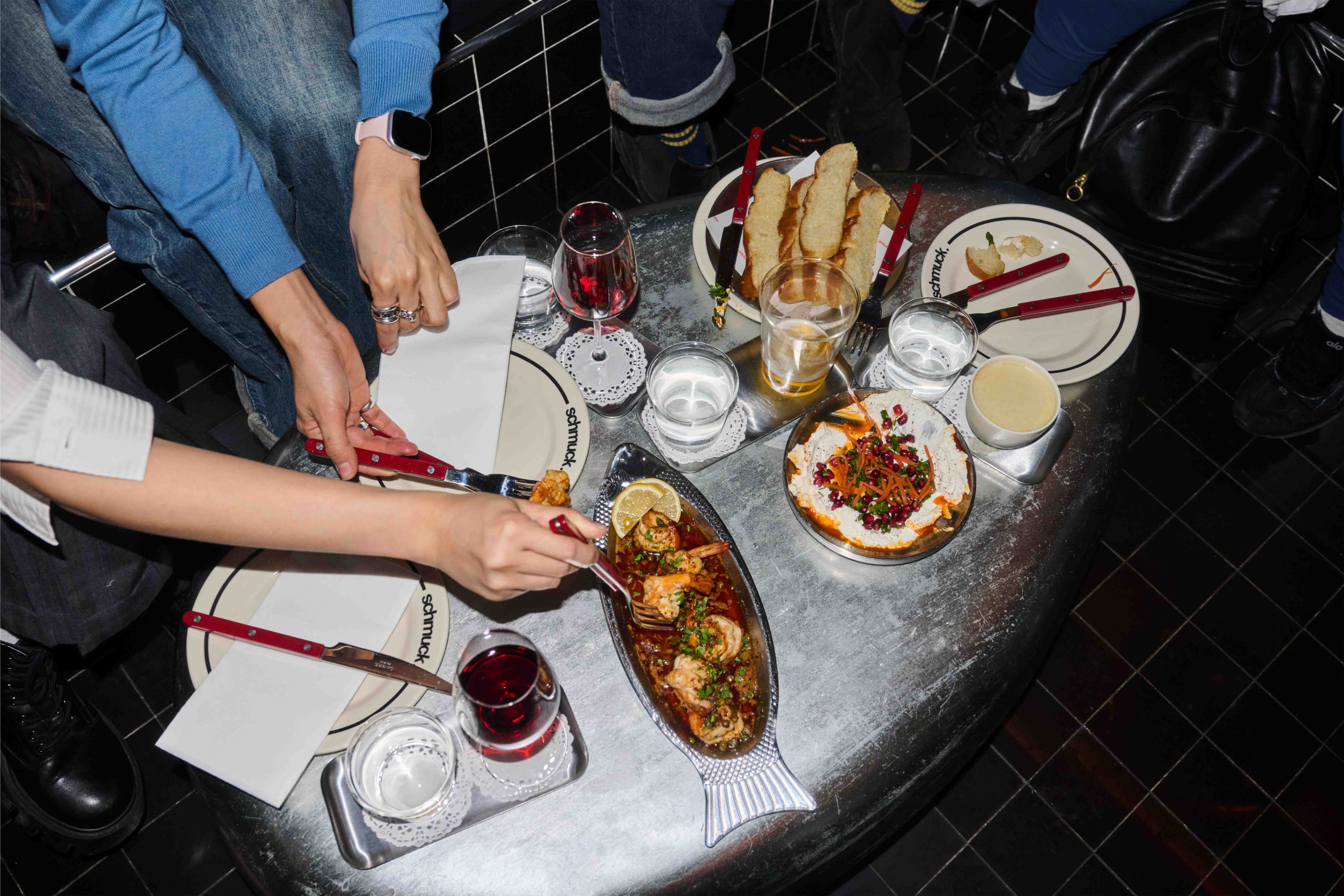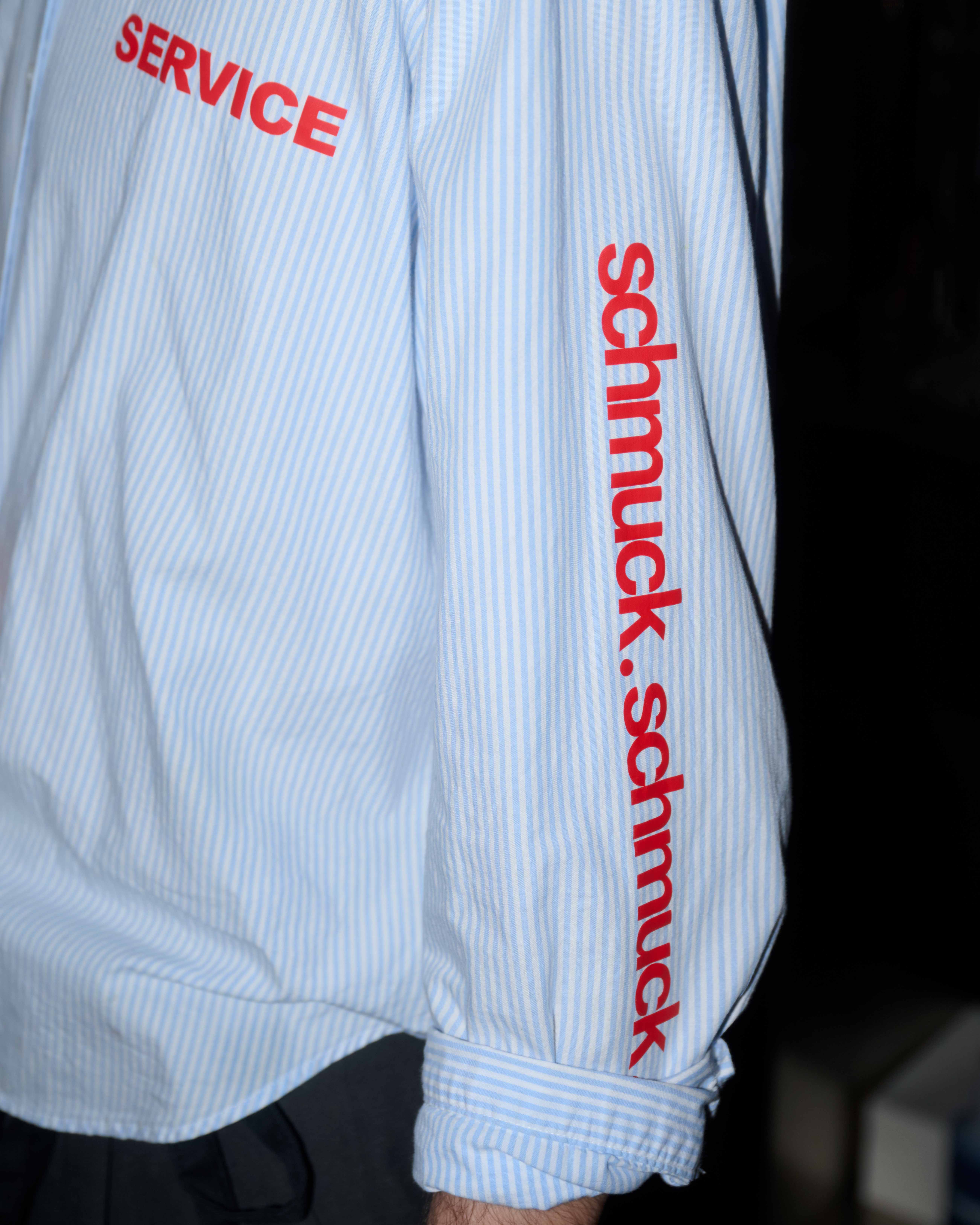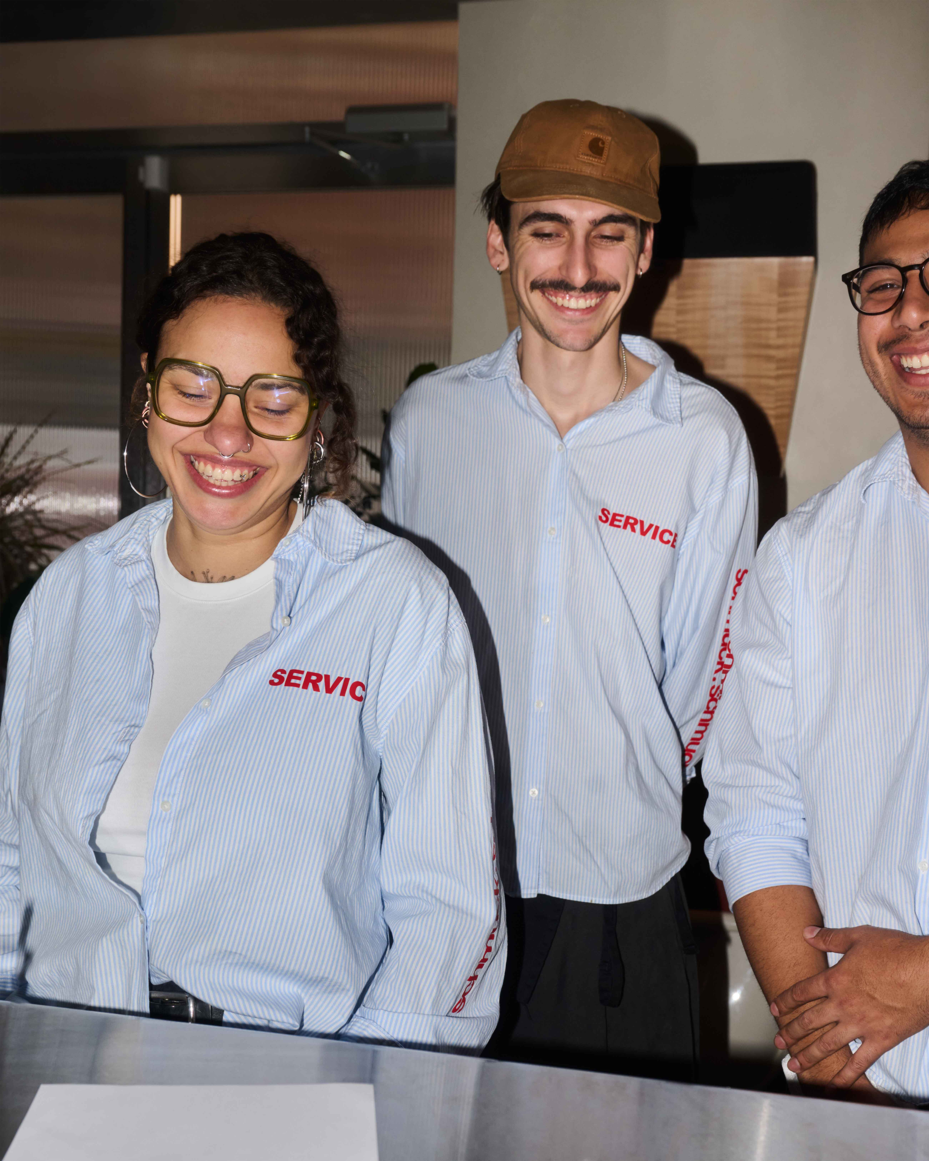 “We made Schmuck as our living room, because we didn’t have one.” The space is a collage of their influences. A rug on the wall by a French designer references the way homes are decorated in Iraq. A custom-made host stand by Swiss firm USM reflects the Larrouy and Aljaff’s space-age design aesthetic. Even the staff wardrobe is a thesis on personal style: multiple silhouettes, no forced matching, but unified enough to feel intentional. “We hated uniforms when we came up in bars,” he says. “So we made a whole wardrobe that allows our staff to feel comfortable being themselves.”