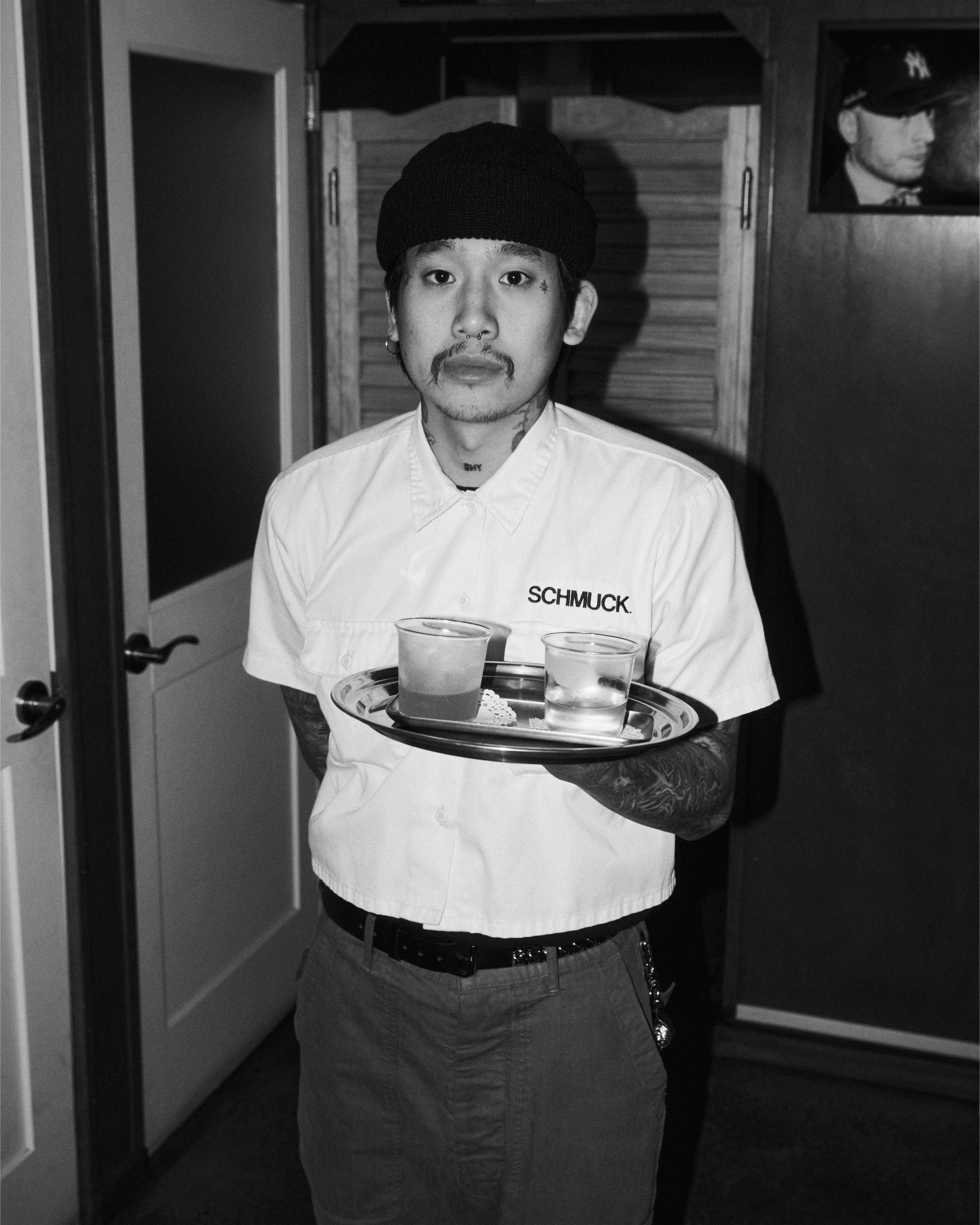 It’s 4:15 on Thursday afternoon, and Schmuck is already full. As bartenders weave past space-age lamps and designer chairs in cropped Dickies shirts, pajama sets, and high-waisted pleated pants, Aljaff leans in to keep talking.