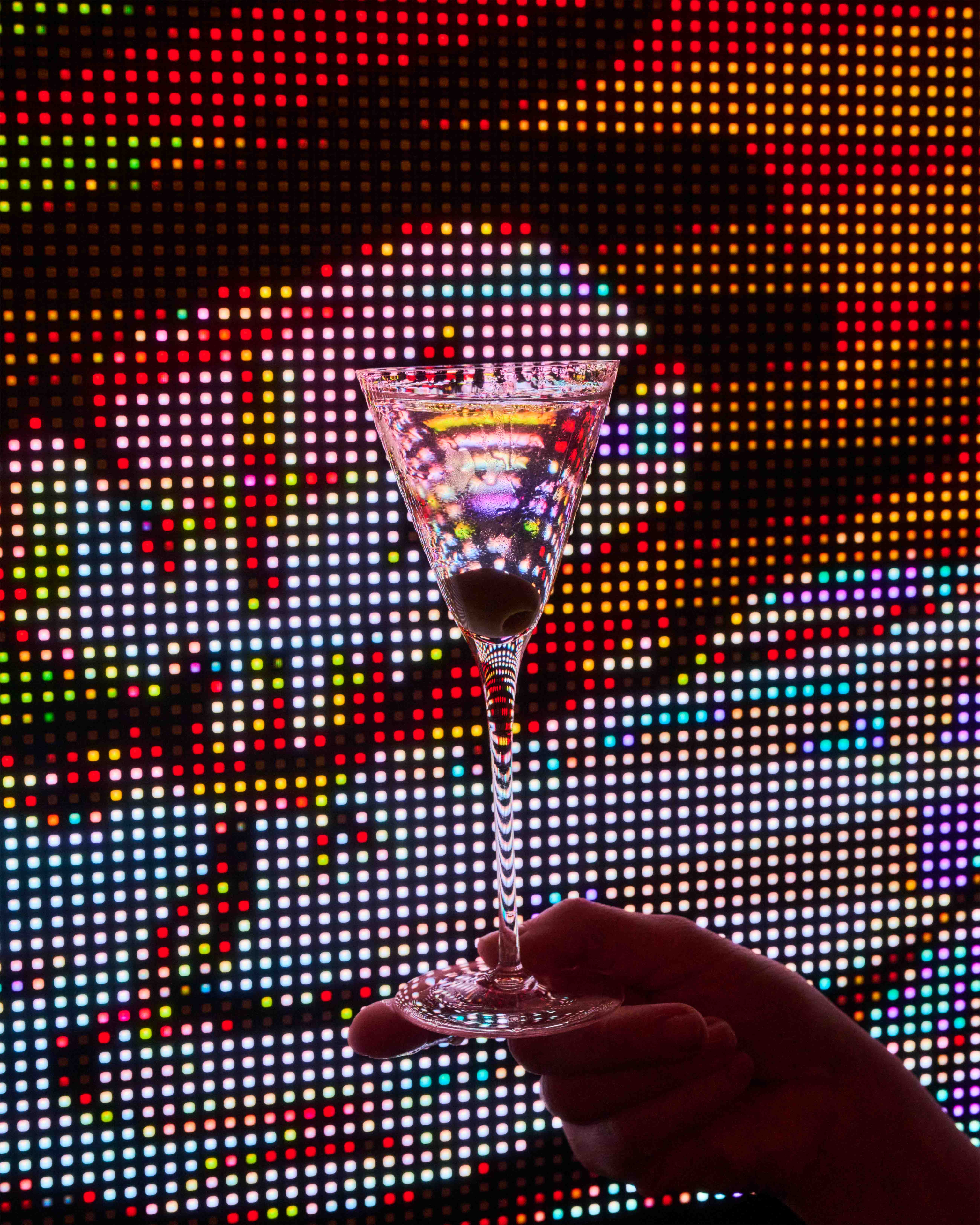 By 5:30 p.m., the room hums with even more energy than before. Olive oil droppers and pickled beetroot highballs are flying across the angular chrome bar.