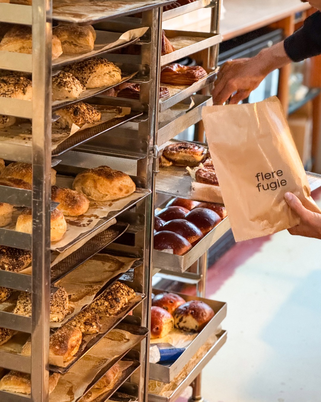 A short distance from Flere Fugle's original Rentemestervej address, their new outpost shifts the focus from café tables to everyday rituals, serving as the primary home for their expanded bakery production. Here, shelves fill with freshly baked breads and pastries, alongside a curated selection of pantry staples, seasonal vegetables, dairy, and house-made ready meals. More neighborhood shop than café, the space makes it easier than ever to bring Flere Fugle home.